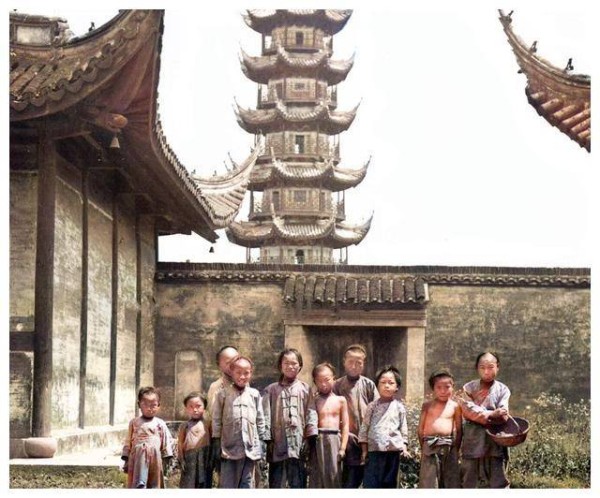龙华塔下的儿童,各自年龄不同,身高差异也很大。有的挎着竹篮,有的光着上身。尽管他们的衣着破旧不堪,但他们的身影依旧充满了活力,令人看了不禁心生怜悯。
