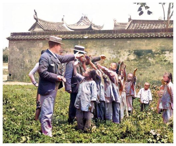 两名洋人男子身穿西装、戴着礼帽,正在向一群儿童撒糖果。他们故意把手中的糖果举得很高,似乎在展示自己的慷慨和善心。摄影师抓住了这个瞬间,记录下了他们做出的“善举”,这场景也成为了上海老照片中的一部分。