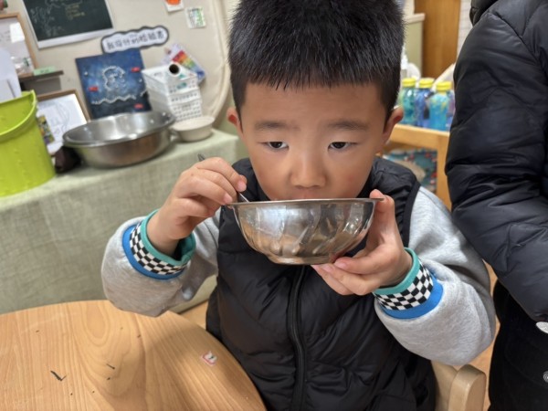 烧火完成后,就到了打鸡蛋的环节。孩子们洗净小手,拿起鸡蛋,学着老师的样子在碗边轻轻一磕,再用手指将蛋壳掰开,金黄的蛋液滑入碗中。有的孩子动作略显笨拙,不小心将蛋壳掉进了碗里,便认真地用勺子将蛋壳挑出来;有的孩子则熟练地完成了打鸡蛋,还主动帮助有困难的小伙伴。随后,大家用筷子搅拌蛋液,“哒哒哒”的搅拌声此起彼伏,充满了节奏感。