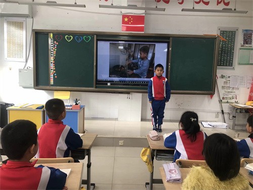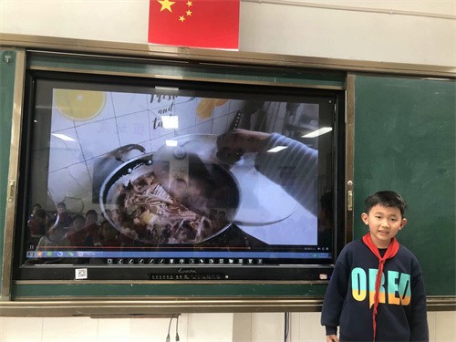 学生走上讲台,借助视频或照片与同学一起分享劳动带来的硕果。茶叶蛋、可乐鸡翅、西红柿炒鸡蛋、麻辣火锅、蛋炒饭、椒盐大虾、土豆炖鸡肉……教室里香气四溢。