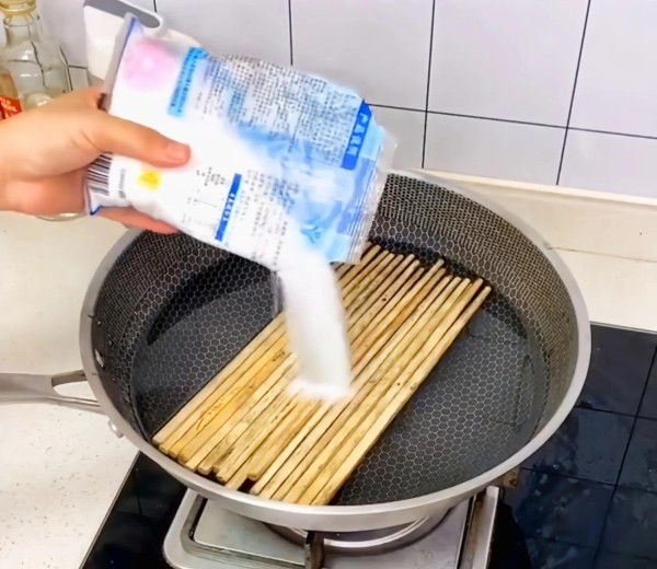 13、筷子用久了发霉变黑,把筷子放入锅中,加入牙膏、食盐、白醋,盖上锅盖煮五分钟,筷子捞出冲一冲就干净啦。