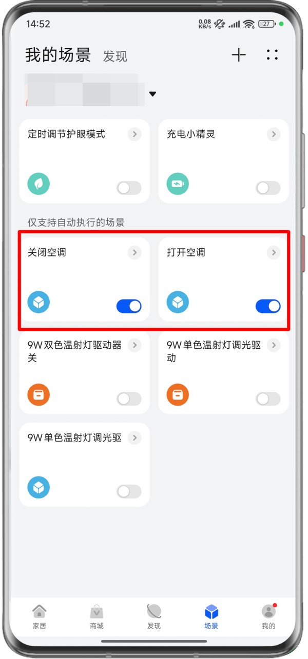 检查是否在智慧生活App场景页中创建有自动打开空调或暖气的场景?是,通过智慧生活App场景页查看,若创建有相关场景,请您将场景卡片中的开关按钮关闭即可以;