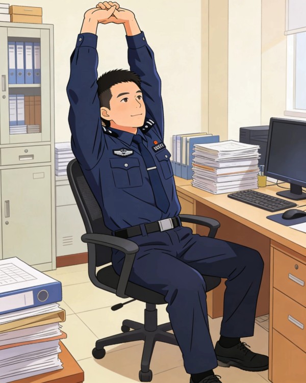 久坐办案、久站执勤后,对肩颈、腰背、手臂进行简单拉伸,通过缓解生理紧绷,减轻身心疲劳,提升持续作战能力。