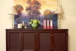 给白色素净的吊灯增加了一组金色线条,提升奢华气质,配合变化的还有其他灯具。餐具柜上的台灯更换为细枝金色座身的台灯,呼应橱柜里的壁灯,金属质地的点缀性加入令餐厅魅力四射。