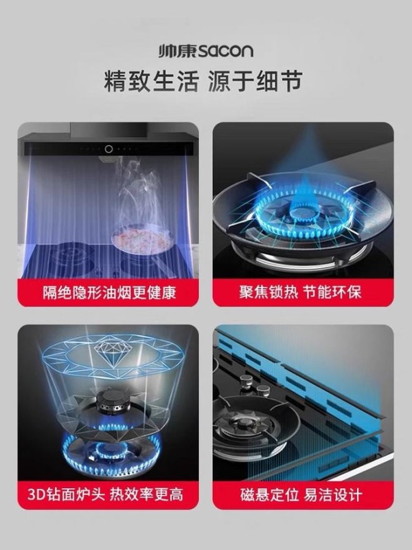 除了隔烟效果一流,这款组合的灶具设备也是极好的,炉头采用的是帅康的专利技术——钻石切面工艺,可以实现多面反射,热效率高达63%。再加上5000w猛火,高温爆炒,能快速提升食物爽脆口感,保留食材的营养和色泽。