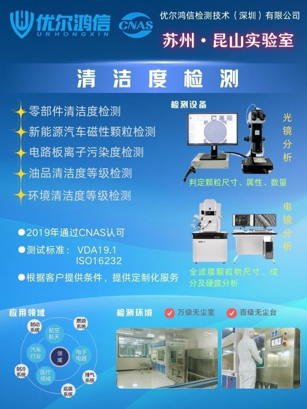 优尔鸿信检测的清洁度测试项目已通过CNAS认可,严格遵循ISO16232及VDA19等检测标准,为客户提供CNAS资质清洁度检测报告