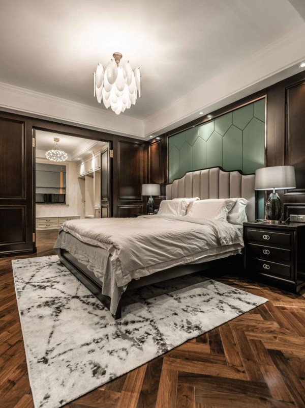 在卧室的设计上,强调的是舒展与放松,没有刻意的豪华,但流露出精致的生活情调。设有装饰派艺术风格的床头板墙,皮革软垫与大胆材质色彩碰撞,以金色饰边作点缀。