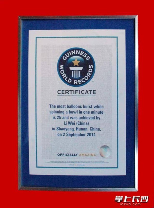 2014年9月2日,李伟迎来人生的高光时刻。在英国吉尼斯世界纪录总部的见证下,他挑战“一分钟筷子旋碗并击破气球”项目。整个过程中,碗始终保持高速旋转,击破动作一气呵成。最终,他以一分钟击破25个气球的成绩,成功刷新世界纪录,获得吉尼斯世界纪录证书。