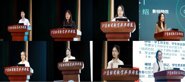 会上,袁飞向全体学生介绍了学院教职员工;甘谓花、张岩、何梦雪、张鲁明等四位老师分别代表法律事务教研室、视觉传达设计教研室、数字媒体技术教研室和婴幼儿托育服务与管理教研室,从专业定位、办学特色、育人成果等方面为同学们进行了介绍;邵白杨、褚旭两位老师分别向大家展示了近年来学院法律援助中心和“海棠行”助力淮河生态经济带发展志愿服务团所开展的活动、取得的各项成果,鼓励大家积极参加到学院的品牌实践育人项目中;邵佳老师介绍了学生工作的整体情况和学风建设的实施办法,让新生们清楚了在学校的日常管理要求和学风建设的具体措施。