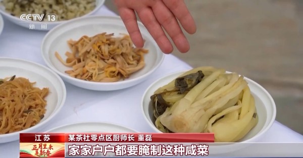 某茶社零点区厨师长 董磊:扬州当地过了小雪节气,家家户户都要腌制这种咸菜。全部要切成丝,非常细的丝,然后下锅炒入味,吃到嘴里面口感就是鲜、香、嫩。