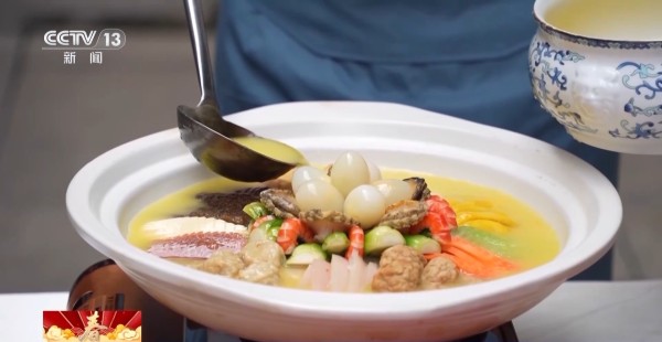 中国淮扬菜博物馆 吴叶青:实际上宴会里面是一道头菜,谐音就是头彩,寓意家庭幸福,团圆美满。飞禽走兽水中鲜,菌菇蔬菜一并全,小火慢炖成美餐。