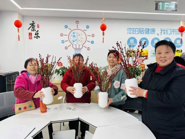 巧手迎春,花艺寄情。活动的压轴环节是DIY插花体验。工作人员提前备好冬青、红色银柳、各色蜡梅等新春花材,以及简约雅致的白色瓷瓶,让老人们自由创作。最后,大家还为自己的作品挂上写满祝福的小挂件,一个个独具匠心的新春花艺作品便跃然眼前。