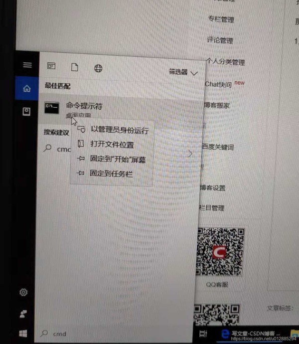 1.通过Cortana搜索cmd,匹配“命令提示符”,右键以管理员身份运行;
