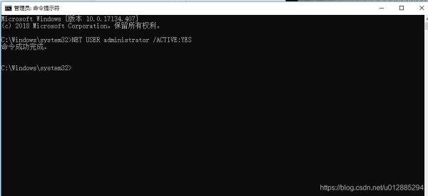 2.在打开的命令提示符窗口输入:NET USER administrator / ACTIVE:YES,按回车执行命令,提示命令成功完成;
