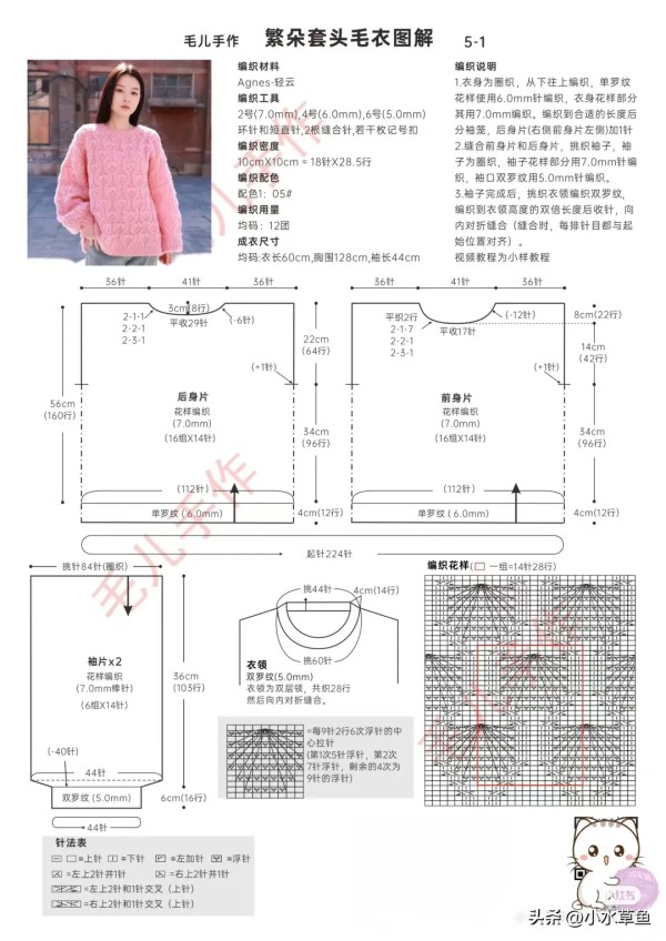 编织工具:2号(7.0mm),4号(6.0mm),6号(5.0mm)环针和短直针,2根缝合针,若干枚记号扣