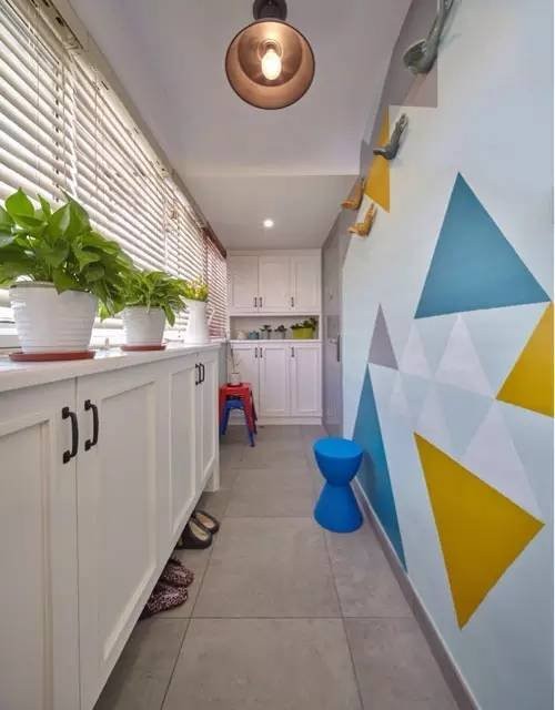 入户主色调为素净的白,墙面点缀色彩绚丽的装饰品及图案,形成有趣鲜明的对比,使视觉感受不单调。为了空间的实用性,设计了足够的收纳,利用率高功能性十足。客厅及餐厅