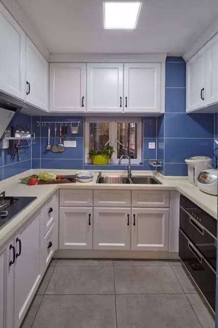 纯净的蓝白调带给人的感觉是清新洁净的,此色调使用在需要保持干净的厨房及洗漱间再合适不过的。厨房U型操作台使空间利用率更高并且更方便使用。加上强大的收纳力,化零为整,更加起到放大空间的作用。洗漱间
