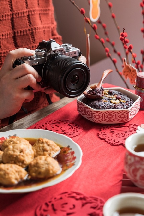 本次,我使用的是尼康Z fc微单相机搭配尼克尔 Z 微距 50mm f/2.8镜头进行拍摄。拍摄场景方面,我在室内简单布置出一个小型的餐桌场景,以简单的几个菜品抛砖引玉,搭配充满年味的装饰,创作出一组年味十足的家常年夜饭照片。