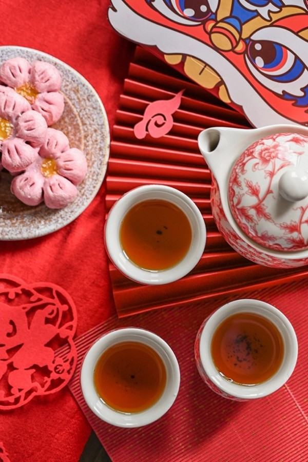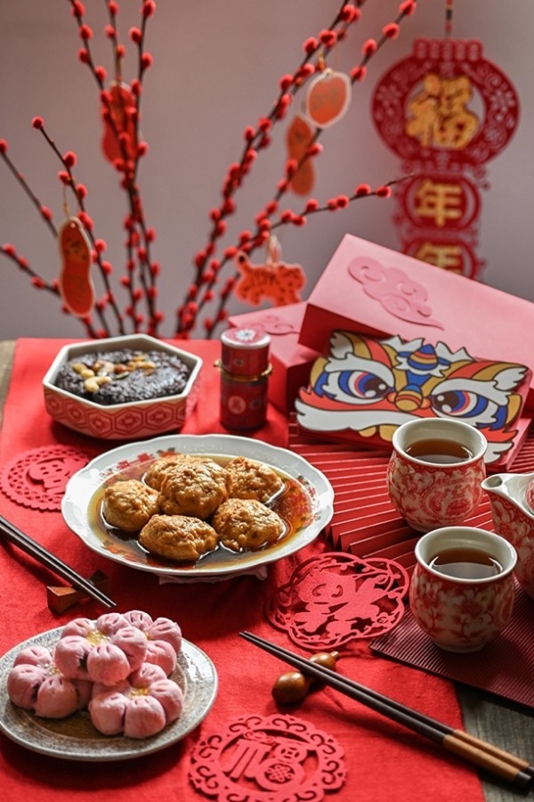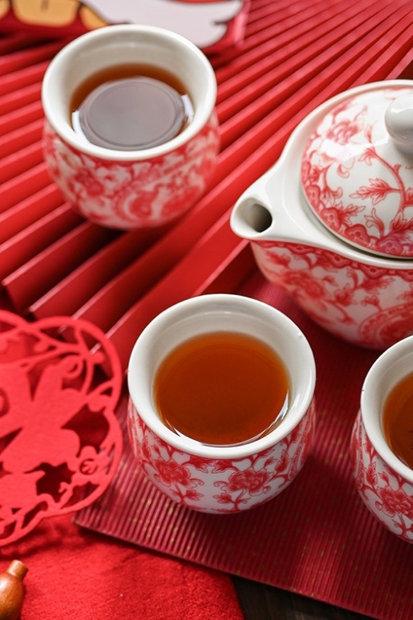 而在餐具和茶具的挑选上,我也依旧选择了带有红色纹样的中式器具。另外,我还用了一些红色礼盒、狮头红包、红色福字、红色折扇等小物件来装饰场景。