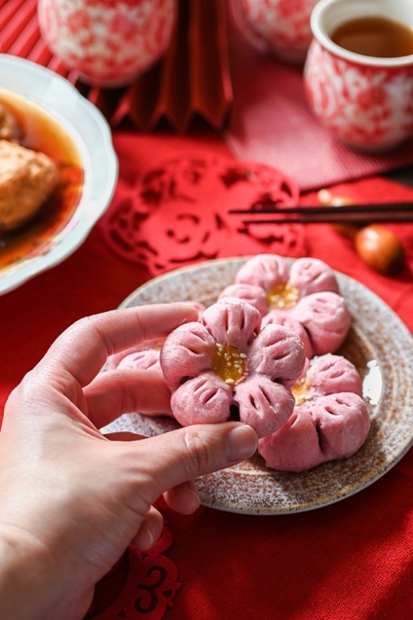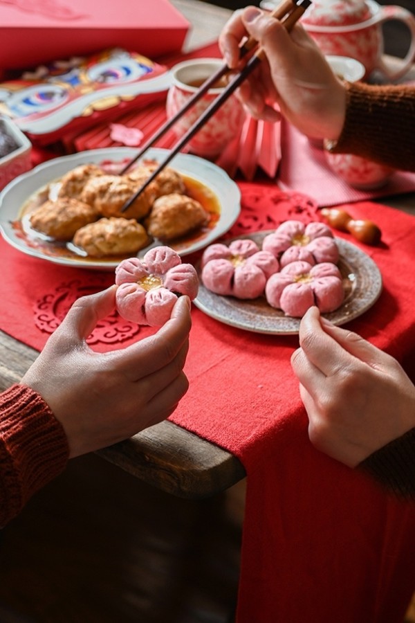 其一,人物直接与食物互动。比如让模特或者家人用手直接拿起桃花酥,只拍摄手部动作。虽然人物入镜但不需要露脸,这样更有代入的氛围感。
