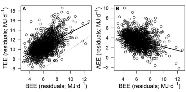 研究发现,在没有进行繁重体力劳动和长期食物短缺的条件下,参与者的总能量消耗(TEE)与基础能量消耗(BEE)成正比,而日常活动的能量消耗(AEE)却与基础能量消耗成反比。