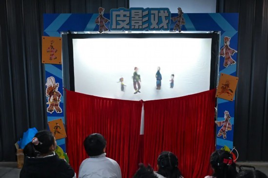 皮影戏台后,同学们和家长一起体验操纵扦杆的乐趣,亲自演绎一段城市记忆,将杨浦的城市发展故事娓娓道来。