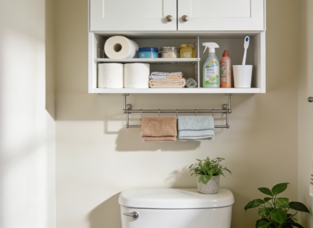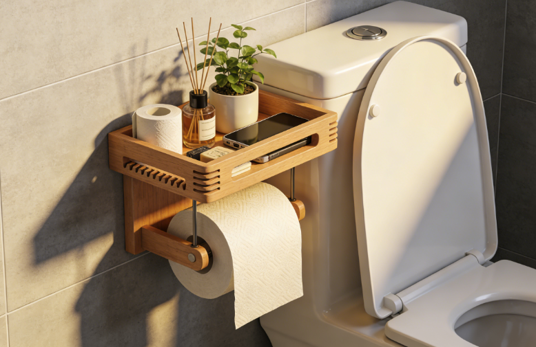 3). 水箱后方藏物件——贴挂钩挂马桶刷,放防水盒;侧边贴窄搁板,缝隙放迷你滑动盒,不浪费一寸空间。