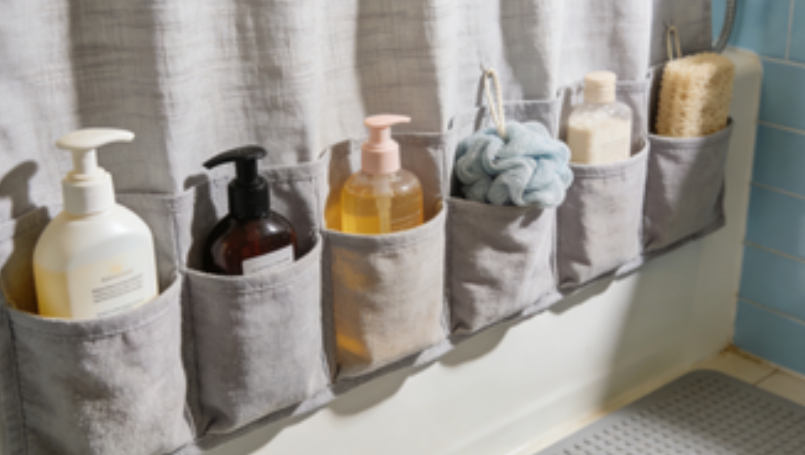2.) 浴帘+收纳袋——无玻璃隔断时,浴帘内侧挂防水袋,放搓澡巾等小物件。