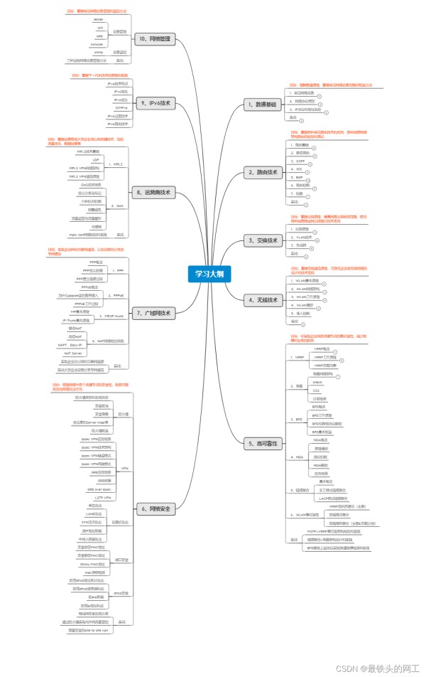 他如果去做一个网络技术相关的专业岗位,只会这一个中小型的网络结构,那肯定是不够的。所以他去进行了更专业的网络技术学习:高可靠性、安全保障以及网络安全相关的防火墙、WAF、堡垒机、入侵检测系统、准入系统。有了数通基础的他学习这些安全设备的时候也如鱼得水。现在网络技术一直在迭代,一直在更新,就像IPv4和IPv6一样,所以他又主动去学了网络相关的新潮技术像IPv6、Vxlan这些。关于他学习网络技术的路线,有一套完整的学习大纲,需要的小伙伴可以直接点赞+关注后私信(学习)即可获取哦!