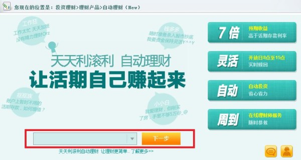 7倍——目前自動理財對應的「天天利滾利」預期年化收益率2.45%,是活期存款利率(0.35%)的7倍。