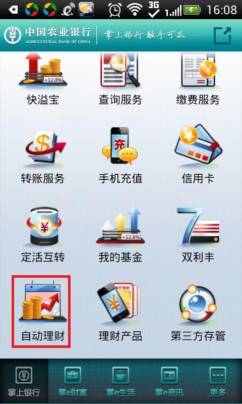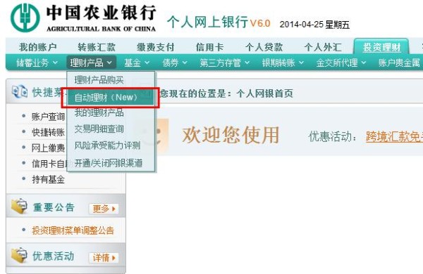 選擇「投資理財」-「理財產品」-「自動理財」菜單。