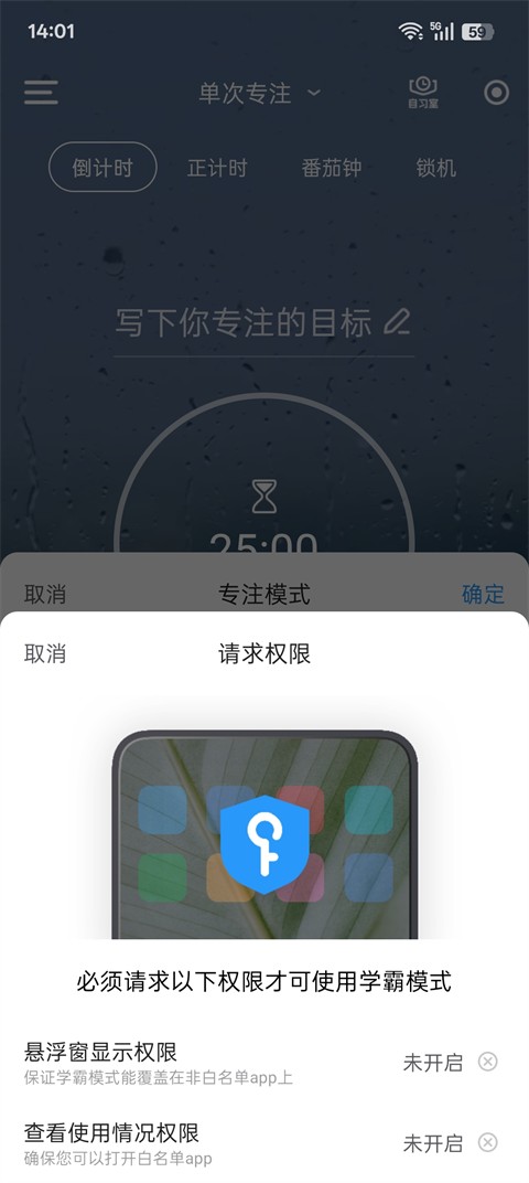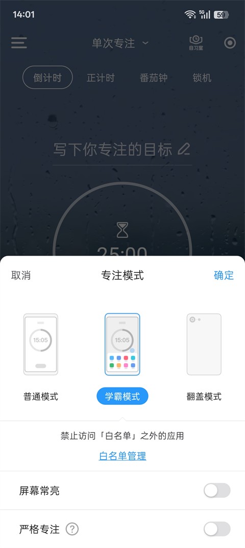 ●学霸模式:在此模式下,你打开任何APP都会被强制退回到时光序专注页面,除「白名单」外;