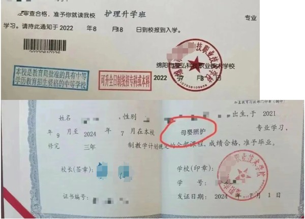 还有四川一个院校,欺骗学生报读护理专业,但毕业证竟然是母婴照护专业,这导致学生们无法考取护士资格证书,三年只能白读。