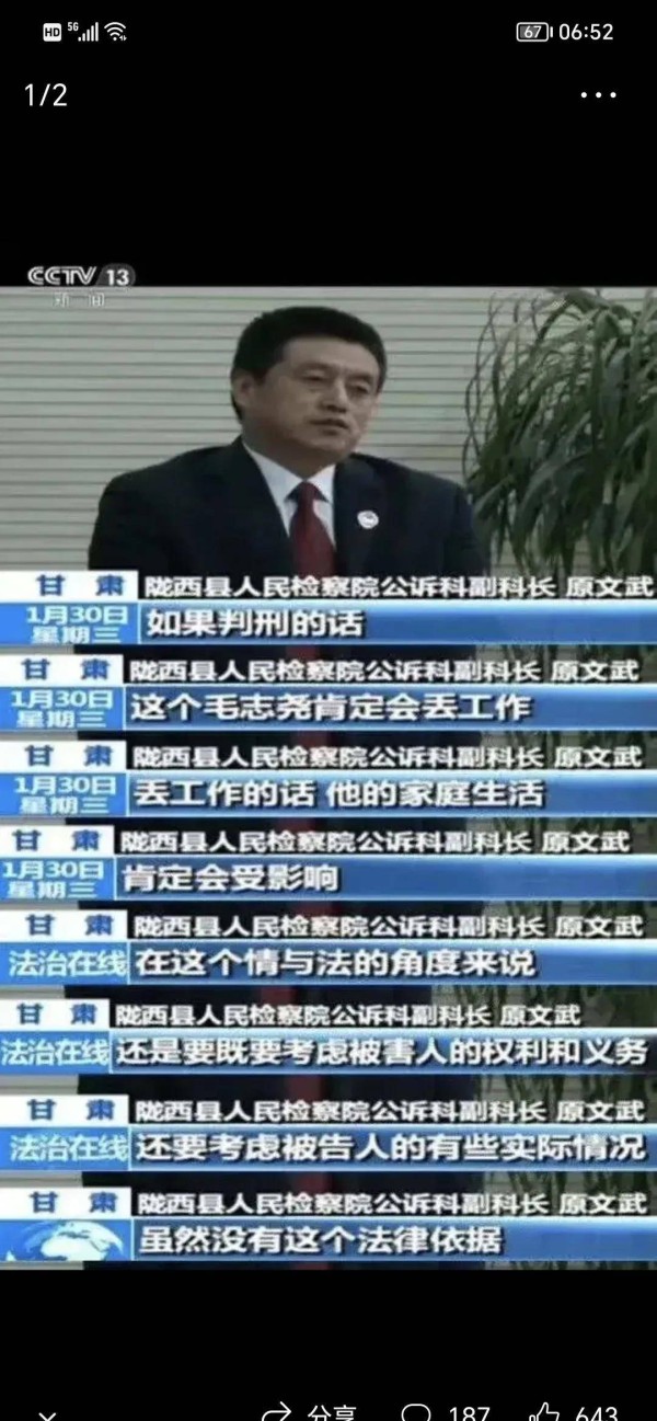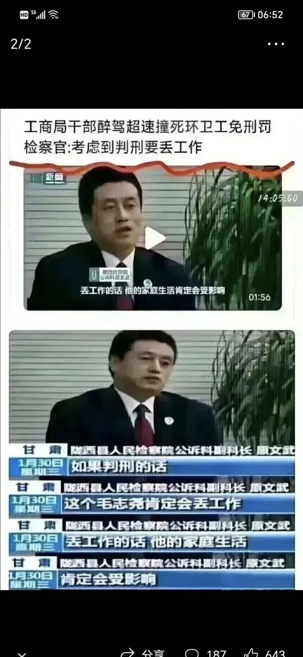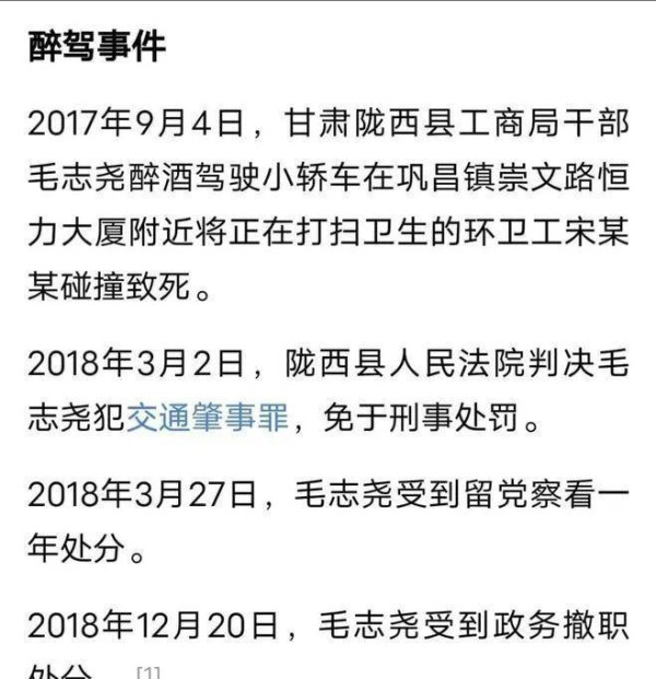 今天在网上看到一则几年前的新闻,不知道出于什么原因又重新火了。事情出在甘肃陇西,据陇西县纪委监委通报显示, 当地工商局干部毛志尧在2017年9月4日醉酒驾驶小轿车将一名环卫工碰撞致死。事情过了半年之后到了2018年3月2日,陇西县人民法院判处毛志尧犯交通肇事罪,免于刑事处罚,3月27日的时候受到党纪处分留党察看一年,到了2018年年底的时候受到政务撤职处分,这就是当时最终的处理结果,醉驾、肇事、撞死人,最终只是撤职了事,当事人还继续留在工商局上班。