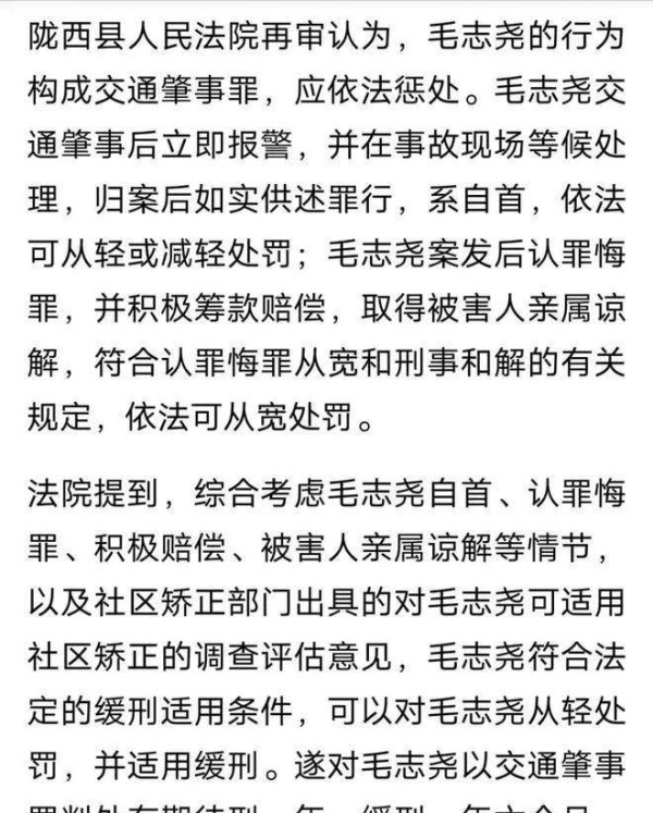 后来国家级的媒体报道了这个案件,才引起重视,法院不得已重审此案。重审的结果是毛志尧被判处有期徒刑一年,缓刑一年半,此事也最终落下帷幕。但笔者相信看到这则新闻的大众,心理肯定都唏嘘不已难以平静。