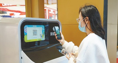 在浙江杭州銀泰百貨武林店,消費者使用空瓶智能回收機。人民視覺