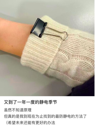 袖口和皮肤摩擦会产生静电,而金属的长尾夹可以在接触其他物体时,把这些静电释放出去,让你身上的电荷积聚少一些。