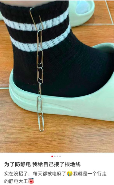 这一串回形针,直接把身体上带的多余电荷导入地面,加上回形针串会长时间和地面接触,所以防静电效果理论上应该挺好的。