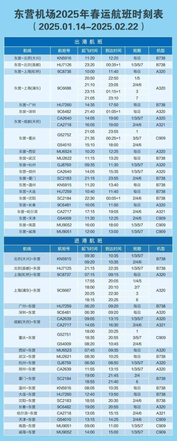 东营机场最新航班时刻表