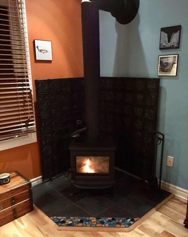 一个工匠使用剩余的瓷砖,水泥板和锡瓷砖为他们的壁炉做了一道防护