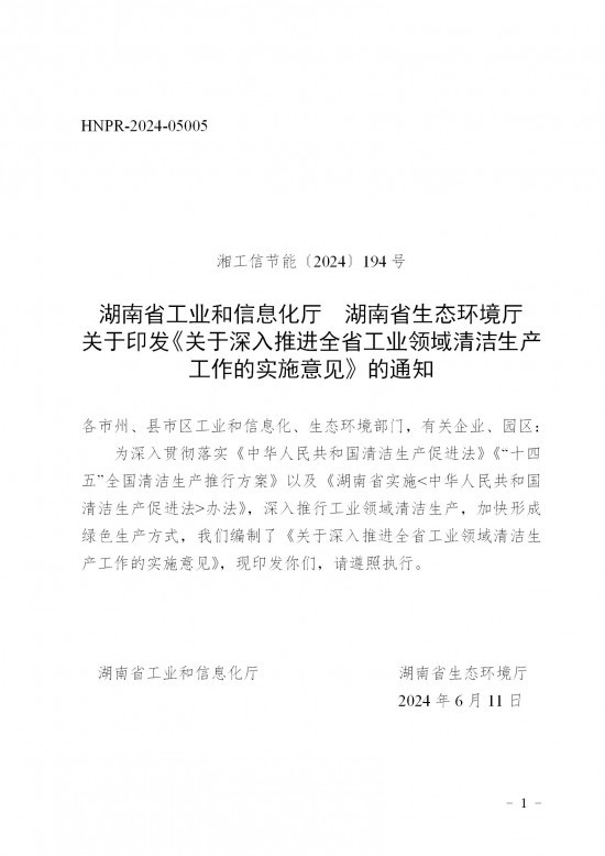 关于湘江流域工业企业清洁生产实施方案的意见关于公布2024年湖南省工业企业清洁生产优秀案例的通知