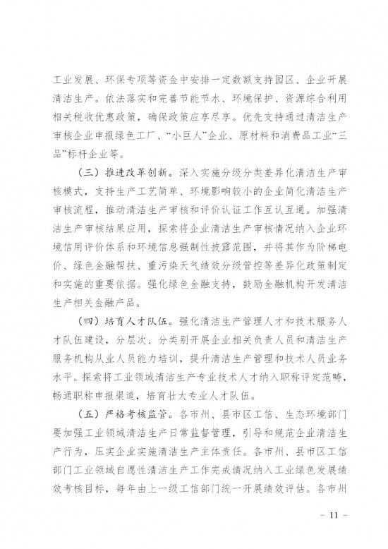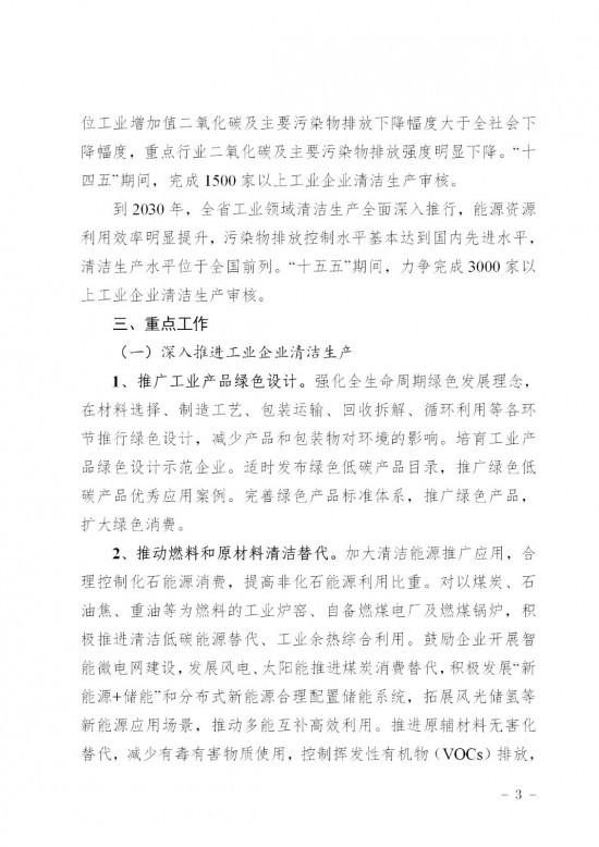 内容明确,到2025年,全省工业领域省市县清洁生产推行制度基本健全,清洁生产工作持续深化,规模以上工业单位增加值能耗比2020年下降14%,万元工业增加值用水量较2020年降幅不低于12%,单位工业增加值二氧化碳及主要污染物排放下降幅度大于全社会下降幅度,重点行业二氧化碳及主要污染物排放强度明显下降。“十四五”期间,完成1500家以上工业企业清洁生产审核。