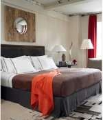 不同层次的灰色营造出素雅、大方的卧室空间,干净、利落并富有清凉感。床头上边的木框圆镜有着闪亮的视觉效果,打破了空间的单调。艳丽的窗帘及床上那一抹火红的点缀,让素雅的房间多了几分活力。