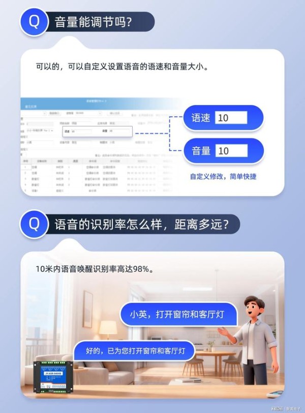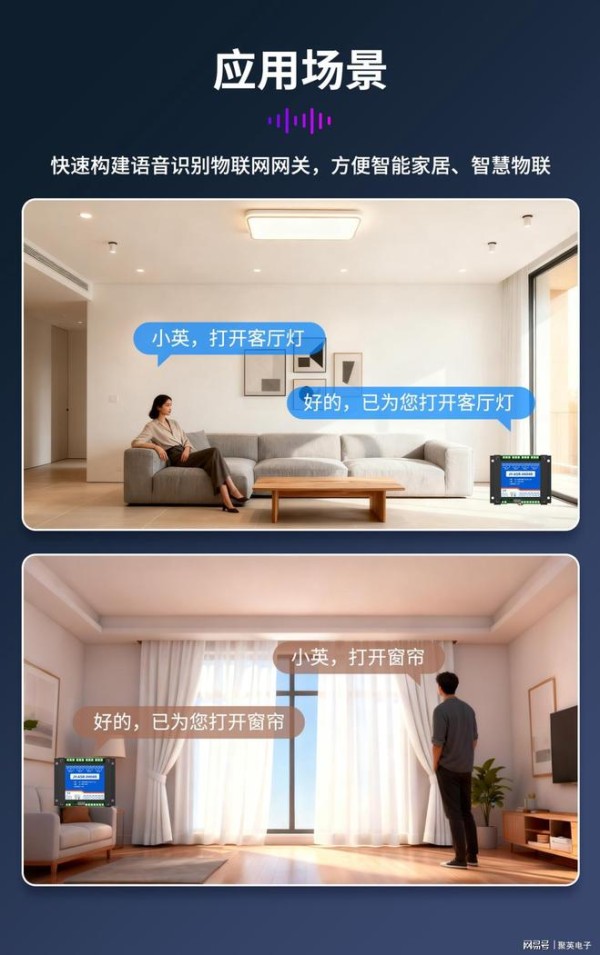 -环境自动调节:联动温湿度传感器、空气净化器、新风系统等,语音指令如“改善室内空气质量”“将卧室湿度维持在50%”,模块自动触发对应设备运行,打造舒适居住环境。