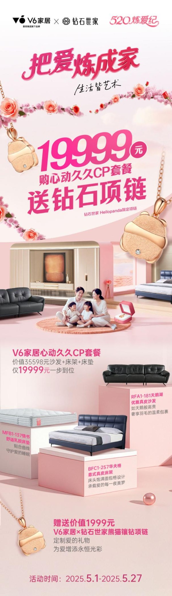在这场以爱为名的跨界联动中,V6家居以“5.2元购520爱意卡”的暖心惠民方式,开启多项权益大礼:仅需19999元就可以买到买“心动久久CP套餐”,更可获赠钻石世家寓意为“你是我的宝”的专属熊猫镶钻项链。据悉,原35598元的“心动久久CP套餐”,包含了RFA1-181天鹅湖优雅真皮沙发、MFB1-137情书舒适乳胶床垫、BFC1-257华夫格意式真皮床架三款爆品组合成,是V6家居旗下当之无愧的明星产品。时值520的浪漫氛围之下,用抄底价购买“心动久久CP套餐”,搭配爱意专属项链,更是让家得到高品位升级的同时,为美好爱情增添永恒光彩。
