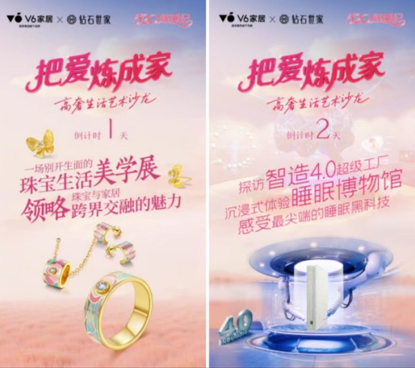 在全国线下超1000家门店联动“520炼爱纪”的同时,V6家居X钻石世家的官方自媒体同样实现了霸屏联动,包括微博、小红书、抖音、公众号等多个线上渠道都带动了消费者对家与爱的话题参与度,更是通过在线直播的形式让全民感受“把爱炼成家”的非凡魅力。而V6家居给消费者准备的惊喜不止于此。在V6家居总部工厂,同样带来了多重福利的工厂直购活动,参观源头工厂、享受底价福利、下单豪礼不停,惊喜与诚意可谓满满。在V6生活艺术馆内,更是以一场名为“熠熠”的奢雅珠宝生活美学展,颠覆了所有人的认知。当珠宝与家居相遇,当V6家居与钻石世家跨界联合,碰撞出生活的绚烂与艺术,充分展现了这场联动的主题——在爱与被爱的瞬间熠熠生辉。