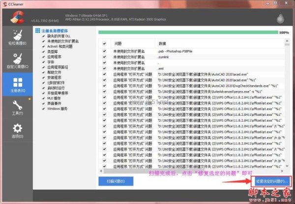 4、耐心等待ccleaner扫描完成,扫描完成后勾选你要修复的选项,点击【修复所有问题】。