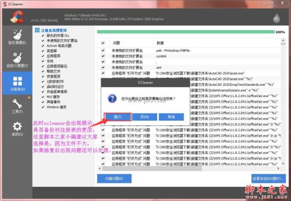5、此时ccleaner会出现提示,是否备份对注册表的更改。这里小编建议大家选择是,因为文件不大,如果修复后出现问题还可以处理。