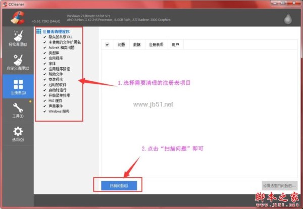 3、如果您想使用ccleaner软件删除注册表问题,点击ccleaner破解版左侧的【注册表】,勾选您要清理的注册表表信息,修改完成后点击【扫描问题】。
