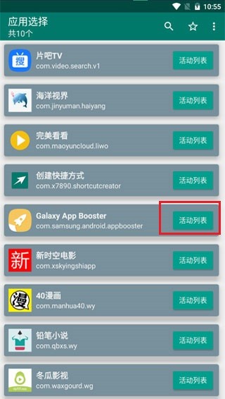 点击想要创建的图标软件,我们现在要的就是“Galaxy App Booster”,点击按钮“活动列表”